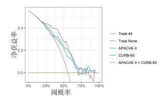 不同模型的DCA显示,APACHE Ⅱ评分联合CRUB-65评分在预测概率为25%~55%左右时,净获益较单APACHE Ⅱ评分及CRUB-65评分模型高,而在其他概率预测区间模型1、模型2及模型3均获益基本相当。见图 4
