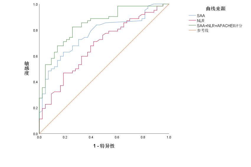 | 图 1 SAA、NLR及SAA、NLR联合APACHEⅡ评分对不良妊娠结局的ROC预测 Fig 1 ROC analysis of SAA, NLR and SAA, NLR combined with APACHEⅡ score for predicting adverse pregnancy outcomes |