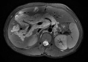 | 门静脉周围不规则长T2异常信号,沿肝内胆管、门静脉延伸 图 1 MRCP |