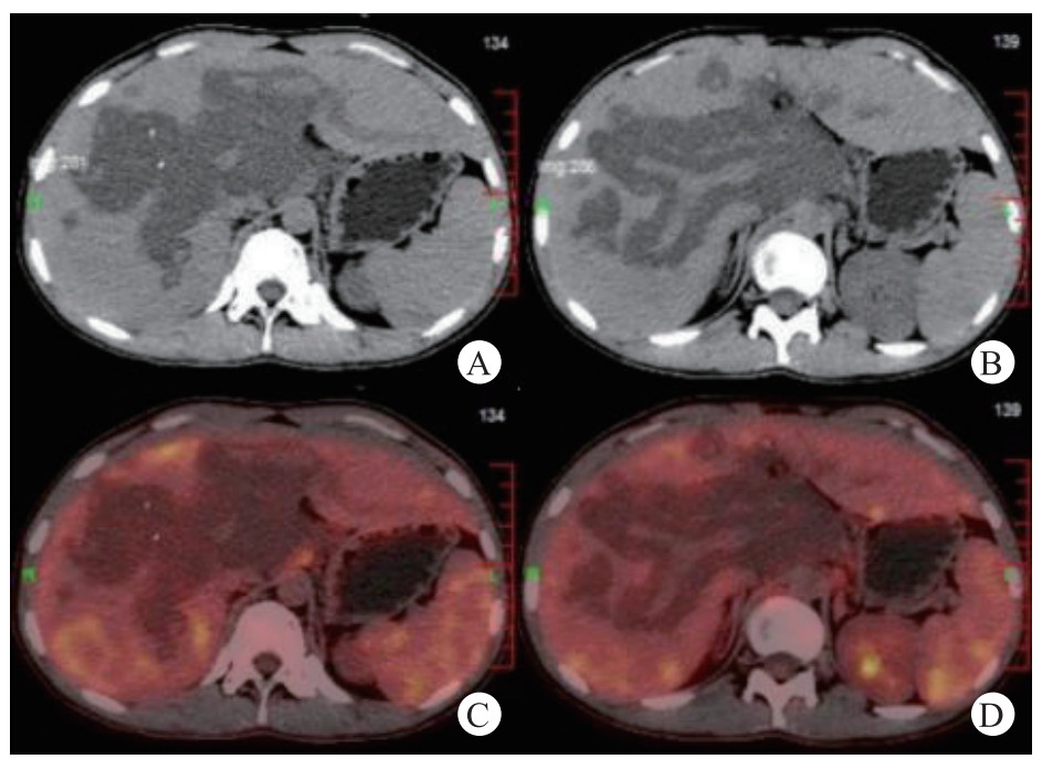 | 增强CT:图A、B,肝门区、胰头周围、肝内门静脉旁弥漫不规则斑片状、条片状低密度影,局部延伸至下腔静脉旁。PET-CT: 图C、D,肝内门静脉分支及主干旁、肝门区、胰头上方见多发囊性低密度影,放射性摄取低 图 2 全腹增强CT对比PET-CT |