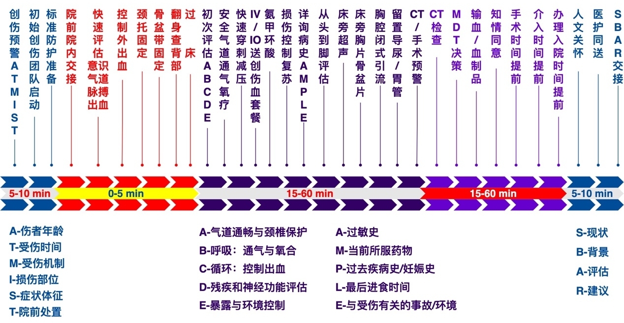 (1)安全气道建立时间=首次气管插管完成时间﹣入室时间;(2)FAST用时=首次FAST完成时间-入室时间;(3)CT用时=首次全身快速CT完成时间-入室时间;(4)MDT用时=首个专科医生到达时间-入室时间;(5)输血用时=首次输血时间-入室时间;(6)术前准备用时=术前准备时间-入室时间。