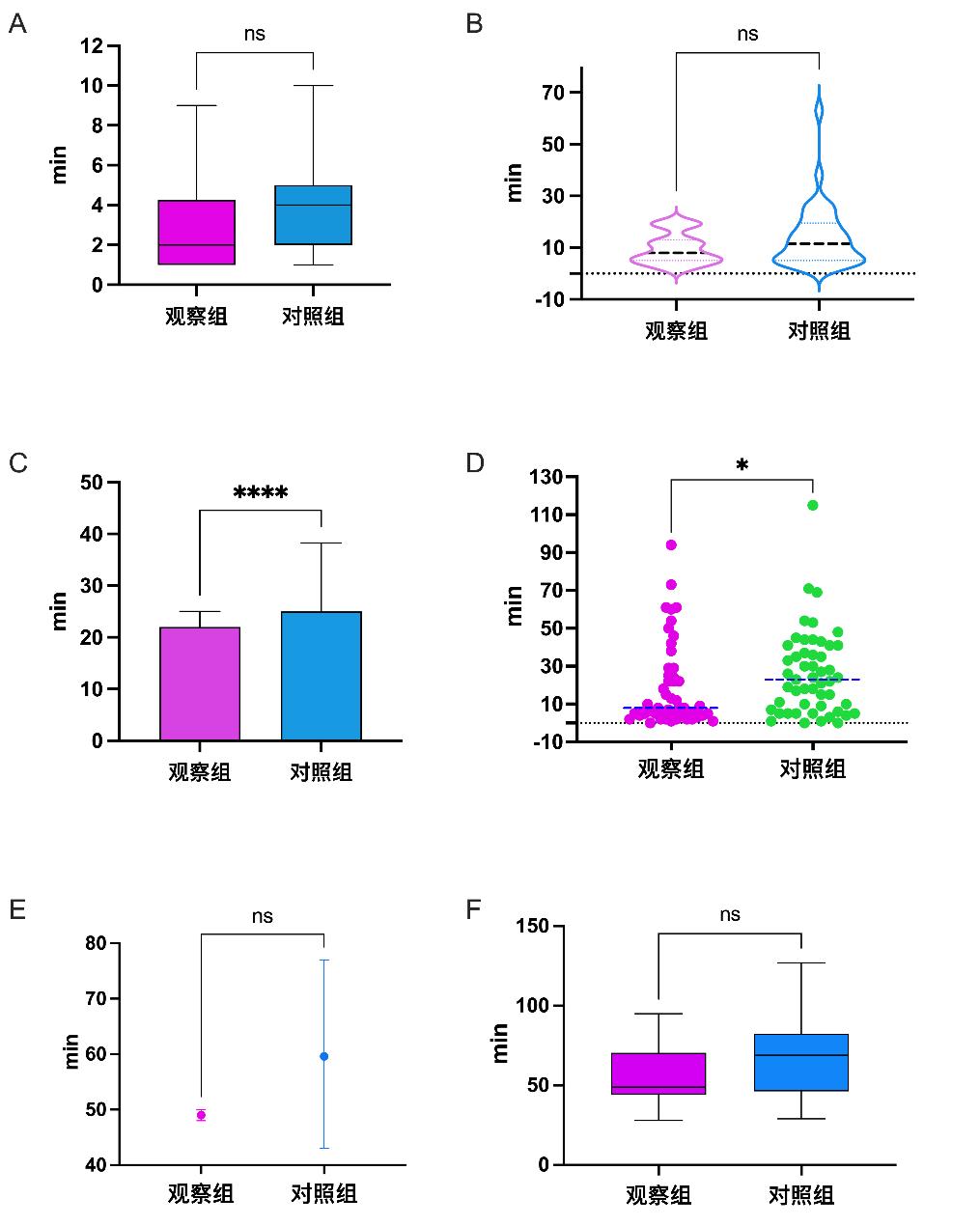观察组10人(14.9%)建立安全气道,用时2(1.00,4.25)min,对照组22人(29.3%)建立安全气道,用时4(2,5)min,差异无统计学意义(P=0.1510),见图 4A。观察组25人(25.4%)行FAST检查,用时8(5,13)min,对照组36人(37.3%)行FAST检查,用时11(5.0,19.5)min,差异无统计学意义(P=0.1911),见图 4B。观察组62人(92.5%)行CT检查,用时22(18.75,25.00)min,对照组76人(78.7%)行CT检查,用时25(21.00,38.25)min,差异有统计学意义(P<0.0001),见图 4C。观察组50人(74.6%)MDT,用时8(4,26)min,对照组51人(68%)MDT,用时23(7,41)min,差异有统计学意义(P=0.0320),见图 4D。观察组3人(4.5%)输血,用时49(48,50)min,对照组5人(6.7%)输血,用时58(49.5,70.5)min,差异无统计学意义(P=0.2500),见图 2E。观察组16人(23.9%)手术,术前准备平均用时49(44.25,68.25)min,对照组20人(26.7%)手术,术前准备用时66.50(46.25,82.50)min,差异无统计学意义(P=0.1605),见图 4F