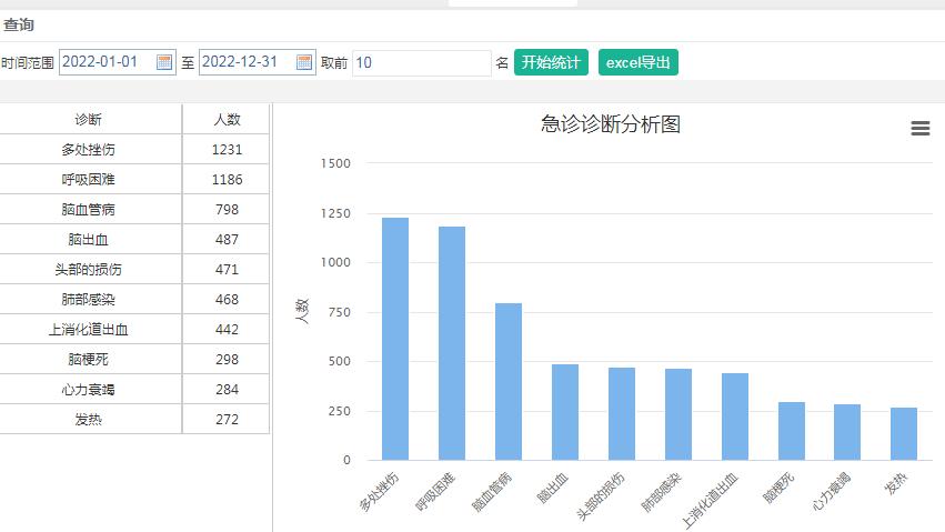4.3 抢救室患者疾病谱分析平台能够对进入抢救室的急诊患者诊断进行实时分析,为急诊医疗资源合理分配提供参考依据。图 2为抢救室救治排名前十位疾病。
