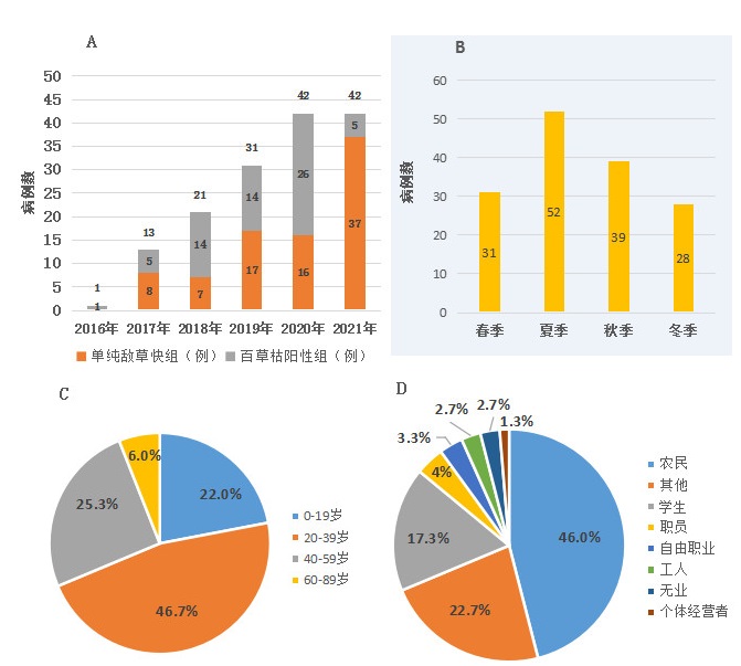 A  为中毒者年份分布;B  为中毒季节分布;C  为中毒者年龄分布;D  为中毒者职业分布 图 1 中毒总体特征分布