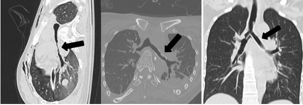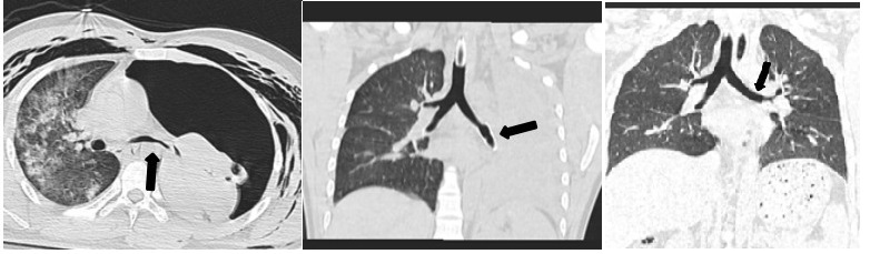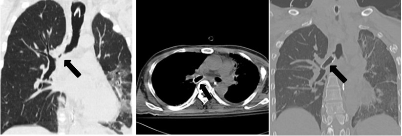 气管支架治疗5例:CT或气管镜明确诊断为软骨环破裂和(或)软化致气管塌陷后,经气管镜置入金属或硅酮支架。1例左主支气管塌陷,置入金属支架1枚,18 d后取出,但管壁仍软化塌陷、脱机困难,予置入Y形硅酮支架,1年后拔出(图 1 A~C),恢复良好。1例隆突上方气管及左主支气管广泛软骨环形破裂、憩室形成,右主支气管开口处软化、塌陷狭窄,置入金属支架1枚,3周后取出(图 2 A~C),恢复良好。1例因左侧气胸、左主支气管塌陷,置入金属支架1枚,术后出现左肺不张,多次经气管镜吸痰治疗,术后2周取出,左肺复张(图 3 A~C)。另2例气管塌陷患者,各置入金属支架1枚,2~3周后取出。5例患者置入支架后均观察到粘痰堵塞,每日予气管镜吸出。5例患者均效果良好,未见支架移位,支架取出后随访6个月以上,未出现气道狭窄。
