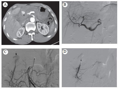 病例2患者男,38岁。因重物砸伤胸腰腹部疼痛1 h入院。无昏迷、呕吐、呕血,无胸闷、气急、呼吸困难,无腹胀、便血、血尿。查体:血压85/56 mmHg,心率120次/min,神志淡漠,上腹部见横行条片状青紫,胸廓挤压征阳性,呼吸音粗,腹肌紧张,呈板状腹,压痛反跳痛明显,肝脾肋下未及,肝区叩痛,肾区无叩痛,移动性浊音检查不合作,肠鸣音减弱。血常规:血红蛋白66 g/L,红细胞1.96×1012/L。CT检查示肝破裂,胰腺头颈部条状低密度,局部结构欠清,胃十二指肠动脉近段斑点状造影剂外溢(图 2A),右肾上腺挫伤伴血肿,多发肋骨骨折,盆腹腔大量积血。入院诊断:重物砸伤、闭合性腹部损伤、创伤性肝破裂、右肾上腺挫伤、失血性休克、多发肋骨骨折。给与输血补液扩容治疗同时急诊DSA:采用5F RH导管至腹腔动脉造影(碘海醇12 mL,速率4 mL/s,压力300 psi),造影示肝动脉走行正常,胃十二指肠动脉起始段局部隆起(图 2B),未见明显造影剂外溢,超选至胃十二指肠动脉造影, 其开口处见团块状造影剂外溢(图 2C),使用COOK 5 mm钢圈2个及1 mm明胶海绵颗粒适量栓塞后复查造影示造影剂外溢消失(图 2D),患者血压回升108/66 mmHg,心率下降至96次/min。术后保守治疗,未见复发出血,术后患者有低热、恶心、呕吐、腹痛、腹胀、胸痛、胸闷等表现,经对症处理后好转,未发生消化道出血胃肠道坏死或穿孔。