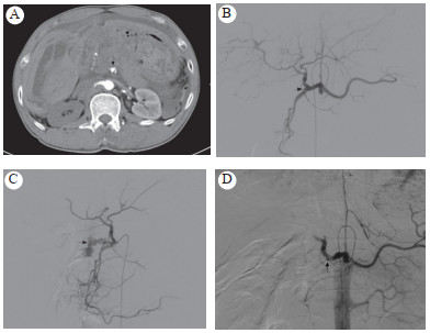 1 资料与方法病例1患者男,60岁。因上腹外伤(钢管击中)致疼痛不适2 h入院,无昏迷、呕吐、呕血、腹胀、便血、血尿。查体:血压90/50 mmHg(1 mmHg=0.133 kPa),心率120次/min,上腹部见皮肤擦痕,腹肌紧张,有反跳痛,肝脾肋下未及,肝区叩痛,移动性浊音阴性,肠鸣音低弱,血常规:血红蛋白70 g/L,红细胞1.98×1012/L。CT检查示肝左右叶挫裂伤,胰腺头颈部结构不清,密度不均,考虑有损伤,胃窦及十二指肠降部结构不清,胃十二指肠动脉近段斑点征及造影剂外溢(图 1A),盆腹腔积血。诊断:腹部损伤、胃十二指肠动脉损伤、肝挫裂伤、胰腺挫裂伤。给与输血补液扩容治疗同时急诊数字减影血管造影(digital substraction antiography, DSA):采用5F RH导管至腹腔动脉造影(philipsFD20 DSA机,碘海醇12 mL,速率4 mL/s,压力300 psi),造影示肝动脉走行正常,近胃十二指肠动脉处局部狭窄,未见明显造影剂外溢,胃十二指肠动脉开口处闭塞未显影(图 1B),行肠系膜上动脉造影示胰十二指肠下动脉近胃十二指肠动脉开口处见团块状造影剂外溢(图 1C),泰尔茂2.7 F微导管超选至近动脉破裂处,使用COOK 2~4 mm微钢圈2个栓塞后复查造影示造影剂外溢消失(图 1D),患者血压回升113/83 mmHg,心率下降至90次/min。术后保守治疗,未见复发出血,术后患者有低热、恶心、呕吐、腹痛、腹胀等表现,经对症处理后好转,未发生消化道出血胃肠道坏死或穿孔。