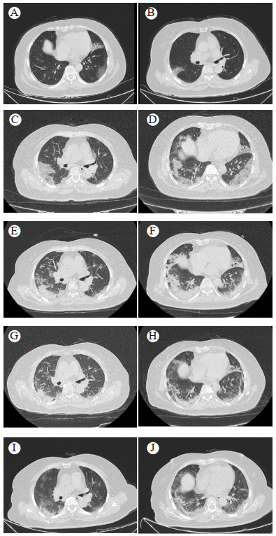 | A:入院时中间支气管平面;B:入院时心室平面;C:住院第5天中间支气管平面;D:住院第5天心室平面;E:住院第11天中间支气管平面;F:住院第11天心室平面;G:住院第14天中间支气管平面;H:住院第14天心室平面;I:住院第22天中间支气管平面;J:住院第22天心室平面 图 1 患者胸部CT影像 |
