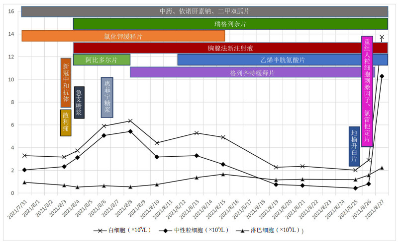 患者治疗新冠感染期间,红细胞、血小板计数均在正常范围内。08-08使用格列齐特缓释片后,白细胞、中性粒细胞呈下降趋势,服药后第2、7、11、13天,白细胞数值分别为4.41×109/L、4.90×109/L、2.26×109/L、2.35×109/L,中性粒细胞数值分别为3.17×109/L、2.52×109/L、0.74×109/L、0.66×109/L,绝对数值变化趋势及药物使用情况,如图 2所示。