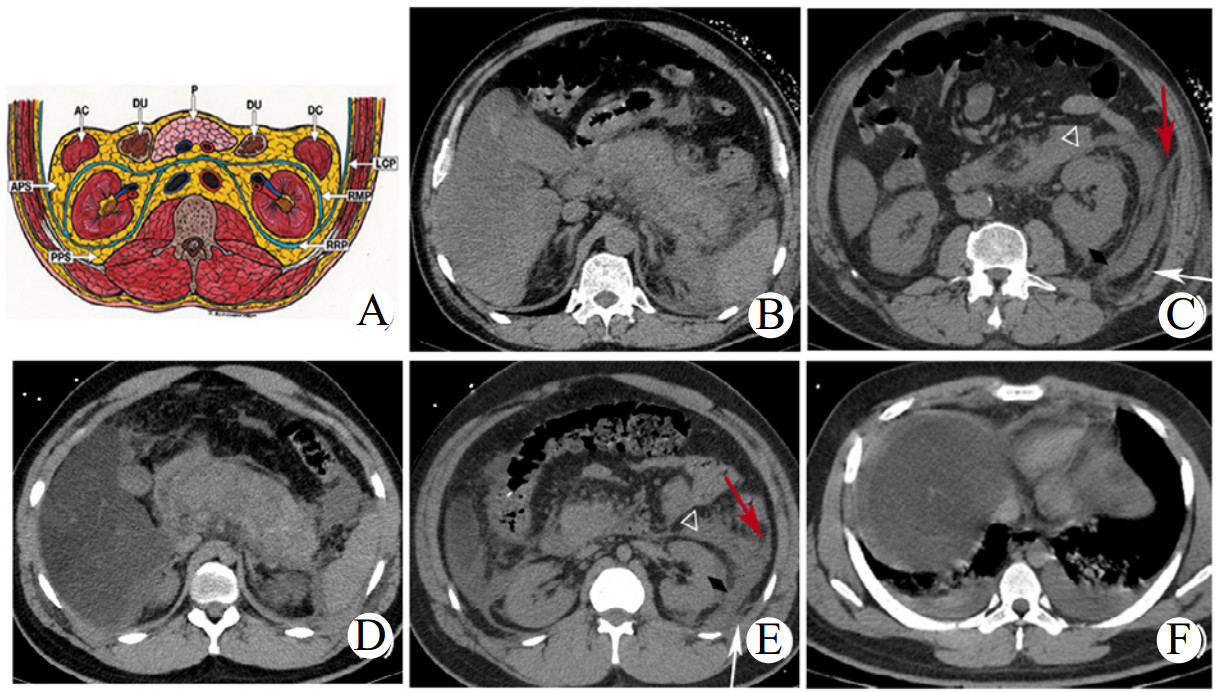 | 图 1 腹膜后间隙断层解剖图及SAP典型CT征象示意图 Fig 1 Schematic diagram of sectional anatomy of retroperitoneal space and typical CT signs of SAP |