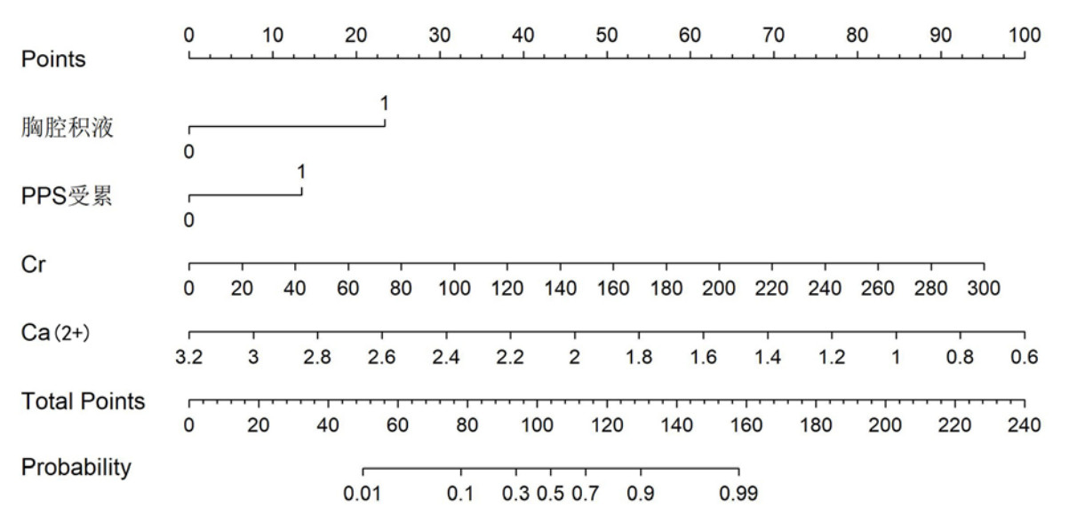 本研究从诸多影像学征象、临床指标中筛选出胸腔积液、PPS受累、Cr与血Ca2+四个指标建立了预测SAP的Nomogram模型并验证,并显示出较好的预测能力、准确性及临床实用性,为临床早期预判AP患者可能发展为SAP提供了一个直观可视、具有较大潜在应用价值的指导工具。