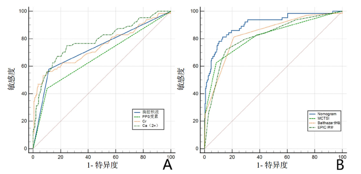 | 图 3 A.四个独立危险因素单独预测SAP的ROC曲线;B.本研究构建的Nomogram模型与MCTSI、Balthazar分级、EPIC评分的ROC曲线比较 Fig 3 A. ROC curve of SAP predicted by four independent risk factors; ROC curve comparison between Nomogram model and MCTSI, Balthazar grades and EPIC scoring system |