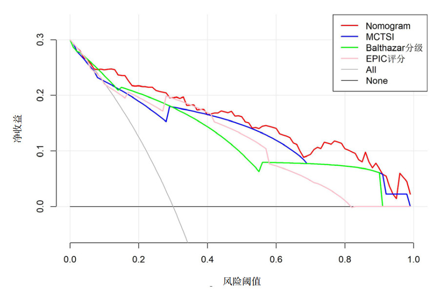 | 图 5 预测SAP的Nomogram模型、MCTSI、Balthazar分级、EPIC评分的决策曲线(DCA) Fig 5 Decision Curve (DCA) for predicting SAP by Nomogram model, MCTSI, Balthazar grades and EPIC scoring system |
