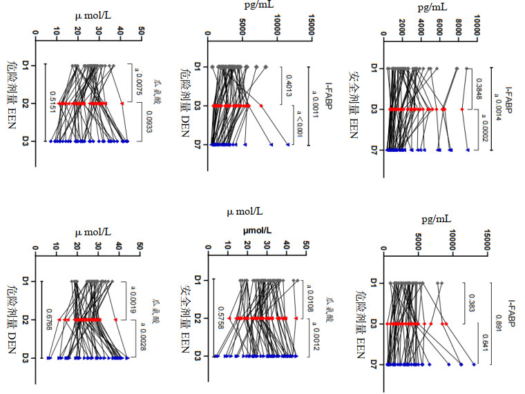安全剂量EEN组与危险剂量DEN组变化趋势相同:I-FABP从D3至D7开始有明显下降趋势(P<0.05);瓜氨酸从D1至D3降低,但从D3至D7开始回升(P<0.05)。而危险剂量EEN组,I-FABP在监测期内无明显变化(P>0.05);瓜氨酸仅在D1至D3有明显下降(P<0.05),随后变化差异无统计学意义(P>0.05)。见图 1