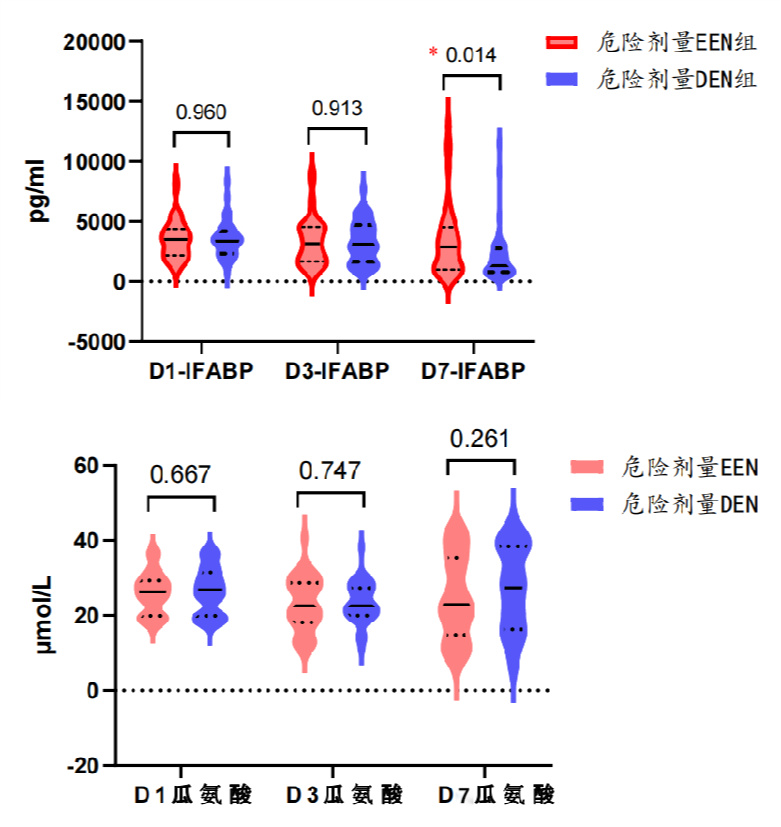 本研究结果显示:首先,通过安全剂量EEN和危险剂量EEN比较,喂养中断发生率更低(20.41% vs. 46.34%,P=0.009),7 d内接受EN的总时间更长[(102.82±39.71) h vs. (67.46±37.16) h,P<0.001],这是疾病的严重程度决定的。从安全剂量EEN肠道生物标志物的变化中看到,I-FABP从D3至D7开始有明显下降趋势(P<0.05),瓜氨酸从D1至D3降低,D3至D7开始回升(P<0.05);而危险剂量EEN组,I-FABP在监测期内无明显变化(P>0.05);瓜氨酸仅在D1至D3有明显下降(P<0.05),但D3至D7无明显回升(P>0.05);对比结果提示该安全剂量下EEN和危险剂量DEN均能很好地逆转肠细胞的的坏死,促进肠细胞功能的恢复。