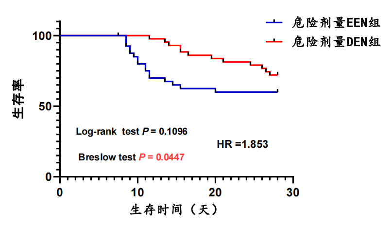 其次,对比危险剂量DEN和危险剂量EEN发现,DEN喂养中断发生率更低(25.58% vs. 46.34%,P=0.047),但7 d内接受EN的总时间相似[(65.72±31.80) h vs. (67.46±37.16) h,P=0.851],两组28 d生存率也没差异有统计学意义(72.09% vs. 60.98%,P=0.280)。通过两组肠道生物标志物对比发现,仅D7-I-FABP差异有统计学意义(P<0.05),分析原因考虑喂养中断是胃肠道不耐受EN的结果,而这种不耐受本质上可能加重肠损伤,而DEN减少了喂养中断发生率,减少了不合适的EN造成的肠损伤,更有利于逆转肠细胞坏死,故危险剂量DEN组第7天的I-FABP更低;但是该组虽然通过延迟喂养时间减少了喂养中断发生率,7 d内接受EN的总时长并没有延长,瓜氨酸的回升受营养底物影响,所以这可能解释了两组7 d内瓜氨酸水平差异无统计学意义(P>0.05)。而对比两组生存时间曲线,本研究采用了两种检验方法,结果显示危险剂量下的DEN可以提高早期生存率(Breslow检验P<0.05),但对最终结局改善不显著(Log Rank检验P>0.05)。