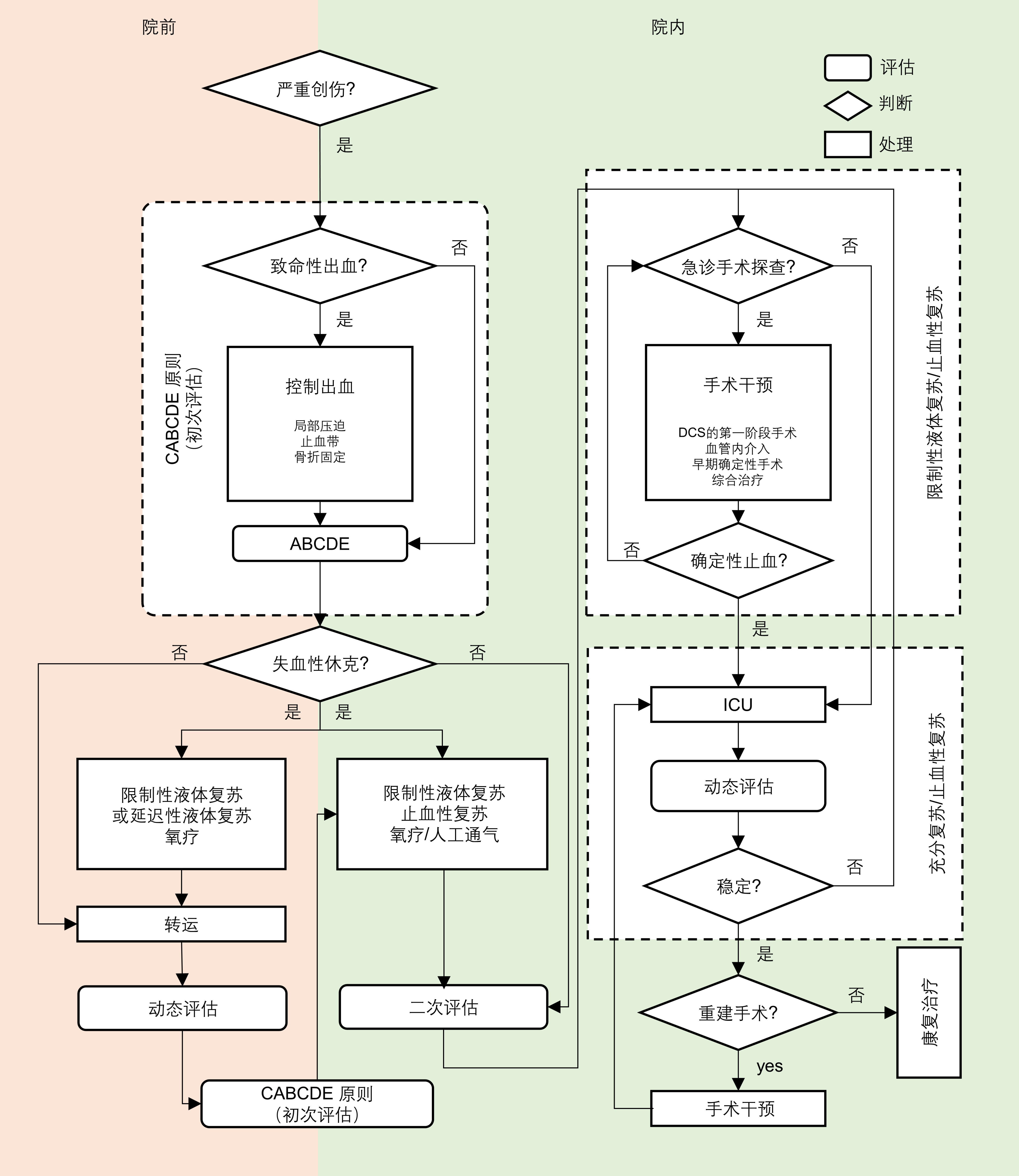 4 院内评估与紧急救治 4.1 创伤失血性休克的早期识别与初步评估首诊患者,应在接诊时按照推荐意见2建立失血性休克的诊断,按照推荐意见2、3初步评估创伤失血性休克的严重程度。