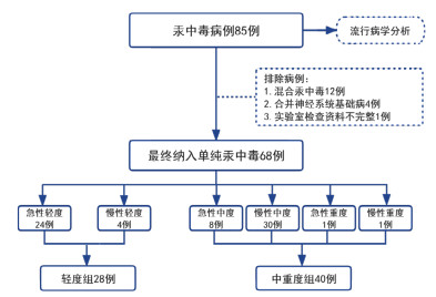 1 资料与方法 1.1 研究对象本研究回顾性选取了郑州大学第一附属医院2011年1月至2020年12月十年间收治的汞中毒患者。研究获得郑州大学第一附属医院科研与临床试验伦理委员会的批准(2022-KY-0871-001)。纳入标准:(1)诊断符合中华人民共和国国家职业病职业汞中毒诊断标准(GBZ89—2007);(2)血液或尿液中检测到汞,同时毒检中心结果符合汞中毒专家共识拟定的血、尿汞浓度诊断标准:(血汞 > 0.015 μmol/L或者尿汞 > 0.05 mg/L)[1];(3)有明确的汞摄入病史,符合以上任意1条即纳入。排除标准:(1)存在铅、铊、砷等其他重金属混合型中毒;(2)合并有其他神经病变者:帕金森及周围神经病变等;(3)实验室检查资料不完整。在进行单纯汞中毒轻、中重度对比分析时,符合以上任意1条即排除。
