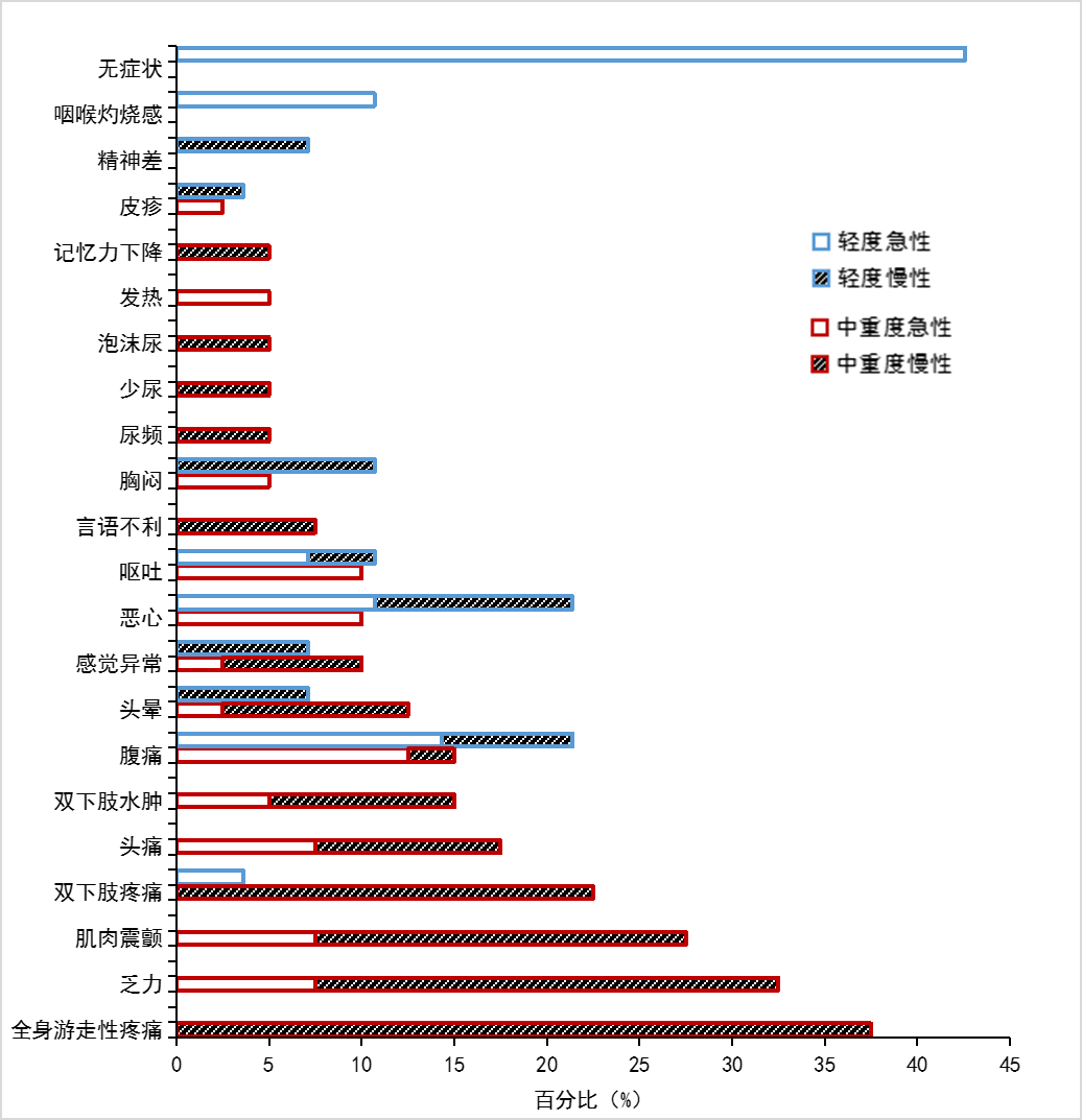 | 图 2 单纯汞中毒轻度组与中重度组患者急慢性亚组首发症状分析 |