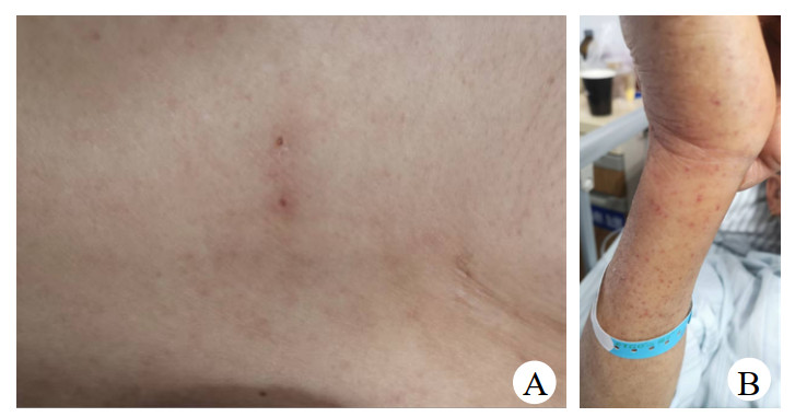 A:腋下有两处焦痂;B:四肢多发皮疹 图 1 患者查体(2022-05-10)