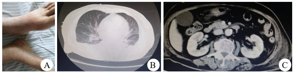 A:双下肢水肿;B:肺水肿表现;C:双肾强化不均 图 2 2022-05-11检查示毛细血管渗漏征