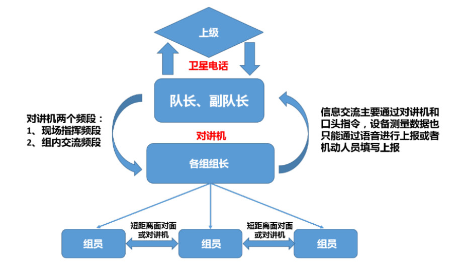 核应急医学救援与常规紧急医学救援相比,涉及辐射监测、去污洗消、辐射防护等专业环节,需要多学科和多单位的沟通合作[1],核应急医学救援的数据传输不仅面临与其他紧急医学救援数据传输中同样存在的前后方信息联络延迟的困境[5],也存在各种辐射监测特种设备信息传输的问题。成都医学院第二附属医院·核工业四一六医院作为国家核应急医学救援分队以及四川核与辐射医学救援队承建单位,在以往的核应急医学救援演练中,救援现场往往以较为传统的信息传递途径进行沟通(图 1)。现场指挥人员通过卫星电话与上级取得联系,现场指令主要通过对讲机以及公网电话拨号向各组组长传达,穿戴防护服时需要使用骨传导耳机进行通话。组内成员在不同地点执行任务,也需要使用对讲机进行信息传达。此外,辐射监测仪器、医学设备所显示的信息需要通过对讲机进行传达,或者由现场机动人员进行主动收集与汇报,暂时无法实现信息自动更新,信息传输的及时性和准确性有待加强。由于救援现场队员以及仪器设备较多,信息整理需要时间,现场指挥决策有较大延时,核应急医学救援信息化水平亟待提高。