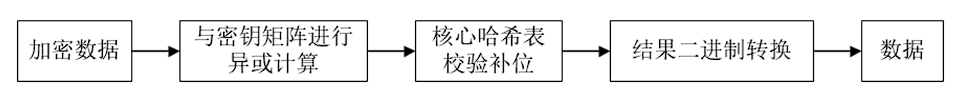 解密数据的过程和加密数据相反,系统服务器收到盖革计数器设备发送的数据后读取加密数据和请求体内设备校验id的参数,对数据进行解密。解密过程(图 10)首先是通过密钥矩阵进行异或计算,得到一个32位长度的数据,第1至16位的数据与服务器通过核心哈希表计算出的校验数据进行对比,如果一样,获取第17至32位的数据并将二进制的数据转换为10进制的数据进行储存。以上数据传输的加密解密过程,可以保障核应急医学救援信息的安全性。
