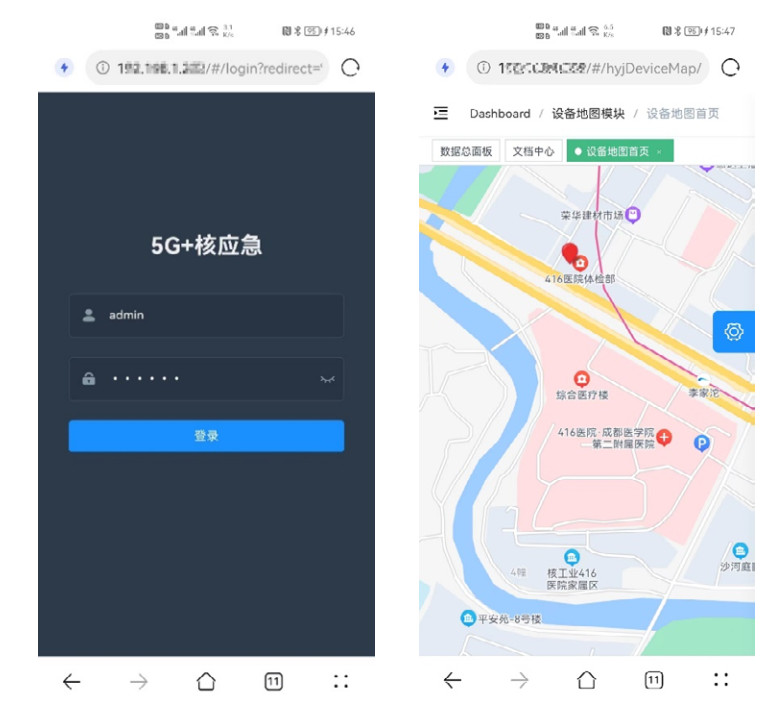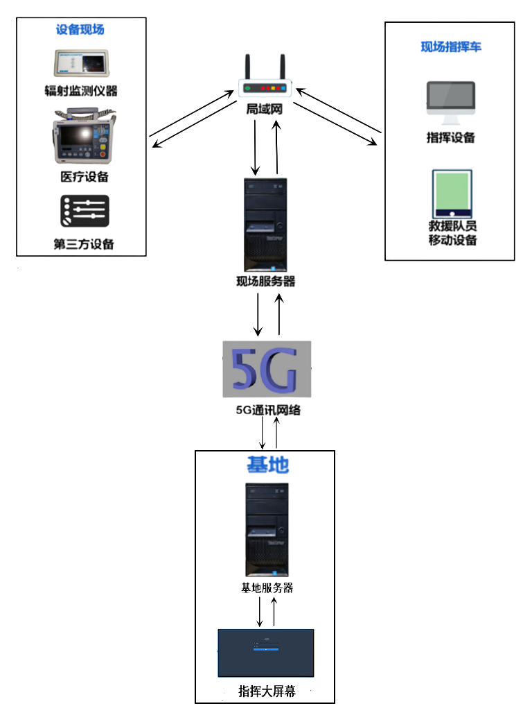 在系统接入上,授权用户可以通过主流浏览器对系统进行访问,在验证账户后可通过该系统查看现场辐射设备、医用设备的实时数据和运行状况,辅助现场指挥和上级指挥决策。同时,该系统在救援现场服务器和后方基地服务器同时运行,项目团队设计了一套可以兼具5G移动通讯通信和其他通讯通信方式的辐射监测数据传输方案,现场服务器可以通过各种网络服务对基地服务器进行数据同步操作,确保数据在后方基地服务器能够及时备份数据,辅助后方指挥人员决策。