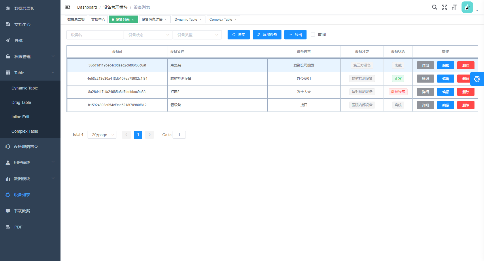 通过对设备进行改造,利用无线通信技术(包括5G、Wi-Fi、蓝牙),对系统内的设备信息进行管理和监控,进行管理的设备不仅包括常用的辐射监测设备,亦可额外兼容适配第三方设备(图 5)。通过该设备模块,可以对设备的相关数据进行提取和分析,所有设备的通信模块采用静默被动的运行状态(即只会由服务器发起请求主动通信),用以提升续航,且每个设备具备唯一的ID码,确保服务器与设备通信时的有效性。通过对设备的信息化管理,全面提升数据采集效率,保证数据的时效性,增强指挥效率。