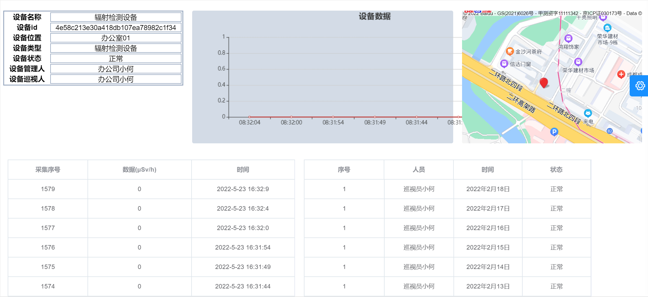在功能上,该系统能够通过预设接口接收设备数据,实现场地环境辐射水平动态变化数据监测功能。对于医学救援分队管理人员,系统可以帮助管理人员的监测医学救援区域辐射剂量水平;对于上级核应急医学救援指挥人员,系统监测的辐射剂量变化情况能够为指挥者决策提供详细数据。