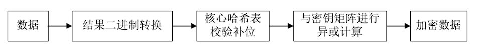 由于盖革计数器采集的数据为自然数(大于等于0的整数),因此本算法使用范围为自然数,通过数学分析和计算机设计原理,设计的加密算法的核心包括了内部设计的加密哈希表、密钥矩阵及运算结果的异或计算。盖革计数器采集的数据先进行二进制的数据转换,转换的二进制结果不足16位的使用0在数据前端进行补位,然后根据核心哈希表根据设备校验id计算出的16位哈希表结果拼接在上述的16位结果之前,接着32位长度的数据和一个规模为5×32位的密钥矩阵进行异或计算最后得到一个32位长度的加密数据,完成整个加密过程(图 9)。