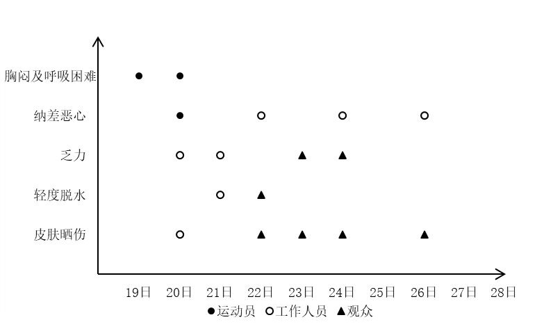 2 结果根据工作人员监控沙滩排球现场气候显示(见图 1),亚运会期间现场气候炎热,赛事开始阶段湿度较大,赛事后期赛场湿度仅有1 d>90%。医疗服务领域共提供健康服务103人次(其中因室外温度过高出现轻度不适61人次;其他出现感冒、轻微伤、包扎等42人次);提供医疗服务44人次(转诊4人次);总体状况正常,无重大疾病报告。其中热相关疾病和运动损伤是本次亚运会宁波赛区医疗服务工作的重点(见表 1),涉及所有涉赛人群,包括各国家(地区)运动员9人、奥委会NOC14人、愿者10人、工作人员11人。涉亚医疗保障人员国家分布有中国大陆、中国澳门、中国台湾、韩国、伊朗、塔吉克斯坦、日本等。其中转定点医院就诊的为塔吉克斯坦运动员因出现中暑后胸闷气促症状停赛,韩国运动员赛后出现明显的乏力不适症状,就诊好转后均未影响第二日赛程。其他热相关症状发病情况如:运动员发病均在赛事早期,症状主要为呼吸困难和胸闷;工作人员和观众的发病没有明显的赛程相关性,症状主要分布在脱水、纳差、乏力和皮肤晒伤(见图 2)。