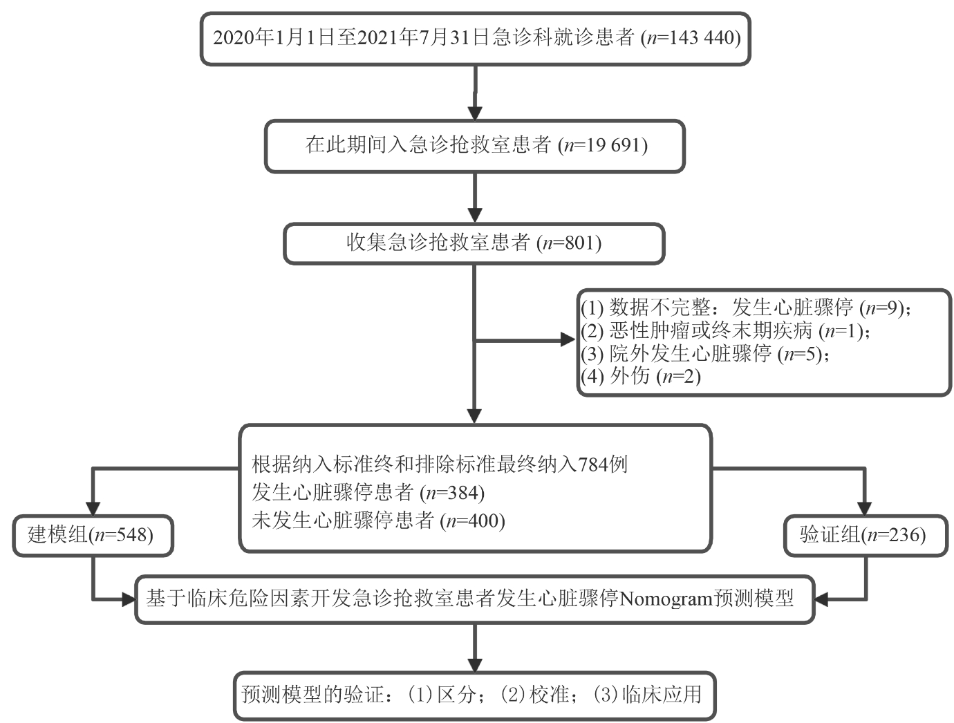 1 资料与方法 1.1 研究对象本研究为回顾性队列研究,收集2020年1月1日至2021年7月31日于新疆医科大学第一附属医院急诊科就诊并收入急诊抢救室的患者。纳入标准:(1)年龄≥18岁;(2)符合心肺复苏术指南中心脏骤停的诊断标准[1]。排除标准:(1)入院前患者已经心脏骤停;(2)在院外发生心脏骤停;(3)恶性肿瘤或其他疾病终末期患者;(4)外伤患者情况已危及生命;(5)临床资料缺失的患者。