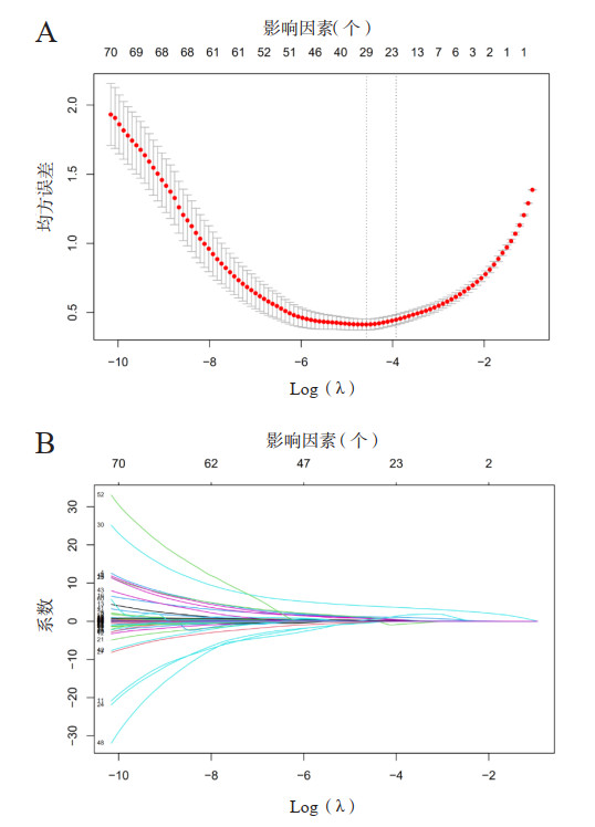 | A为LASSO模型中最佳惩罚系数λ的变化过程,通过调整参数(λ)最小标准来选择10倍交叉验证,左侧虚线表示对应最小λ值(λ min),右侧虚线对应λ min+1个标准误,此时筛选出最佳变量个数;B为描绘73个变量的LASSO系数曲线 图 2 采用LASSO回归模型进行变量筛选 Fig 2 Using the LASSO regression model for variable selection |