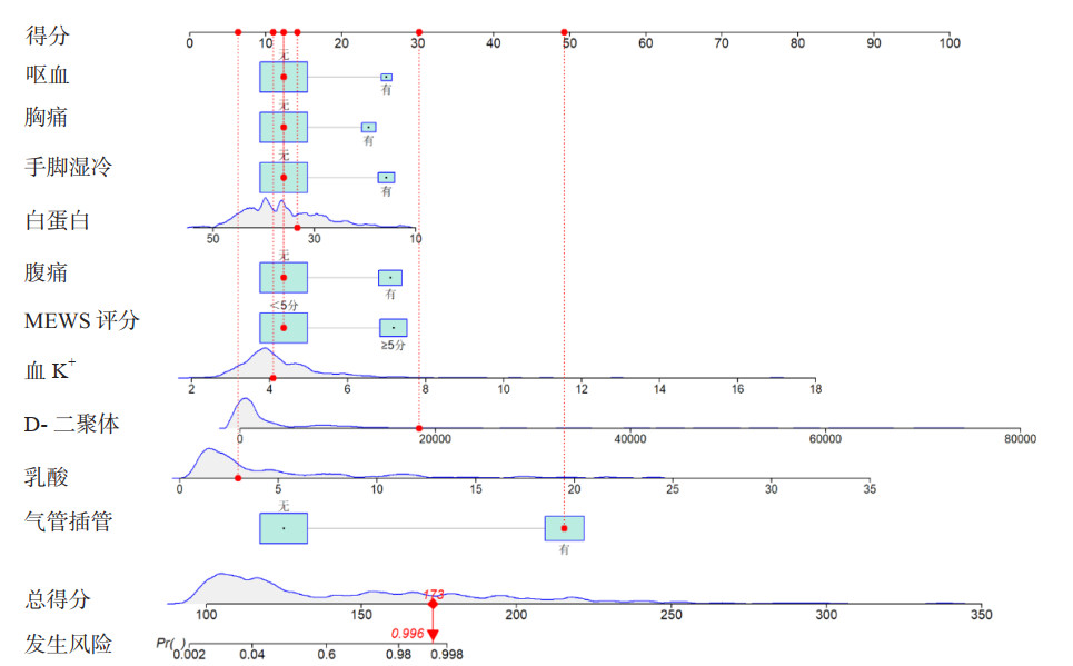 | 一名急诊患者就诊时无呕血、腹痛、手脚湿冷、胸痛症状,MEWS评分 < 5分,血液检查指标:K+为4.1 mmol/L,白蛋白为33.27 g/L,D-二聚体为18 373 ng/mL,静脉血LAC为2.96 mmol/L,有使用气管插管。该患者的总分为173分,发生心脏骤停的概率为99.6% 图 3 用于预测急诊患者发生心脏骤停风险的Nomogram图 Fig 3 A nomogram was developed to predict the risk of cardiac arrest in emergency room patients |
