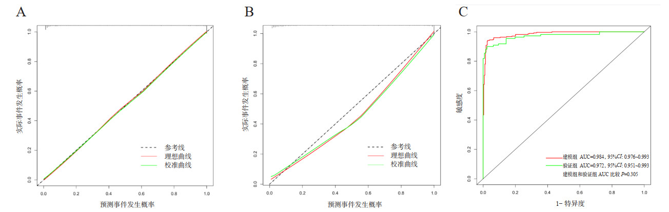 本研究中建模组的未校准曲线和校准曲线一致性表现良好(图 4A),Hosmer-Lemeshow检验(χ2=6.5474,P=0.586)结果差异无统计学意义,理想曲线和校准曲线重合度高,说明预测概率和观测概率近似相等,提示该模型的校准度高,AUC为0.984(95%CI: 0.976~0.993),敏感度为0.942,特异度为0.967,预测准确率为0.954(0.933~0.970)(表 4、图 4C)。在验证组中未校准曲线和校准曲线一致性表现良好(图 4B),并且在Hosmer-Lemeshow检验(χ2=11.421,P=0.179)结果差异无统计学意义,理想曲线和校准曲线重合度高,说明预测概率和观测概率近似相等,提示该模型的校准度高,同时AUC为0.972(95%CI: 0.951~0.993),敏感度为0.900,特异度为0.976,预测准确率为0.941(0.903~0.967)(表 4、图 4C),且建模组和验证组的AUC之间差异无统计学意义(P=0.305)(图 4C)。