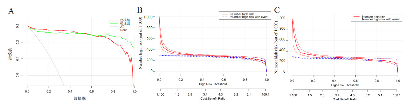 | A为建模组和验证组中的DCA;B为建模组中的临床影响曲线;C为验证组中的临床影响曲线 图 5 Nomogrm图预测模型在建模组和验证组中的临床效用评估 Fig 5 The clinical utility evaluation of the Nomogram predictive model in the modeling group and validation group |