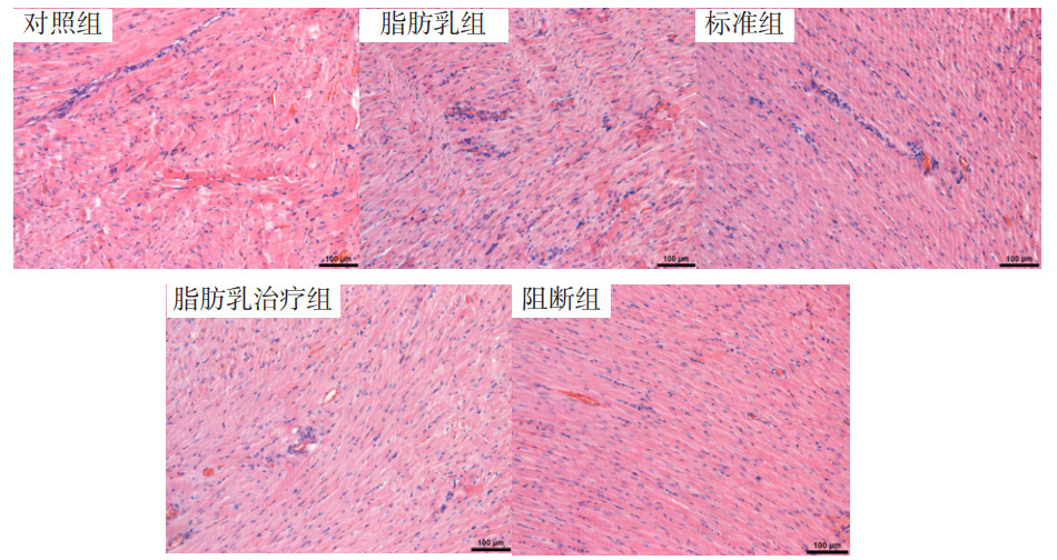 | 组别 | 对照组 | 脂肪乳组 | 标准组 | 脂肪乳治疗组 | 阻断组 | F值 | P值 |
