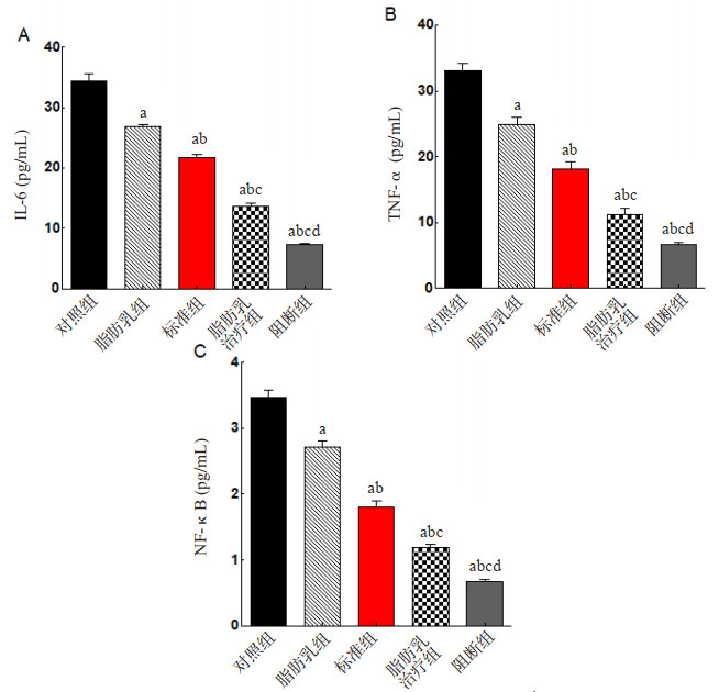 | 注:与对照组相比,aP < 0.05;与脂肪乳组相比,bP < 0.05;与标准组相比,cP < 0.05;与脂肪乳治疗组相比,dP < 0.05 | |||||||
