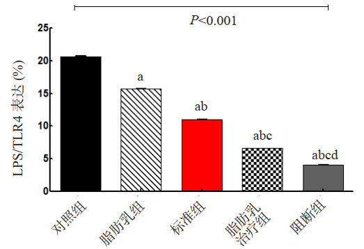 | 与对照组比较,aP < 0.001;与脂肪乳组比较,bP < 0.001;与标准组比较,cP < 0.001;与脂肪乳治疗组比较,dP < 0.001 图 3 各组大鼠心脏LPS/TLR4表达 |
