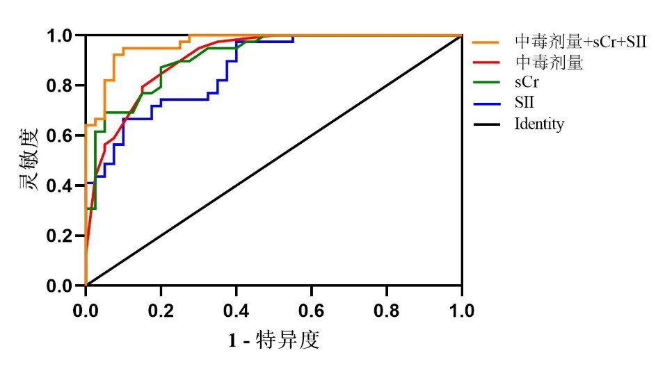 在本研究确定了中毒剂量、sCr和SII是ADQP患者30 d死亡的独立危险因素。ROC曲线分析这3种指标在预测ADQP患者30 d内全因死亡风险方面具有较高AUC值,并且同时联合这3种指标时,AUC明显增加。因此,推测中毒剂量、sCr和SII水平越高,ADQP患者中毒后30 d内全因死亡风险越大,且同时联合这3种指标时诊断价值会明显增加。