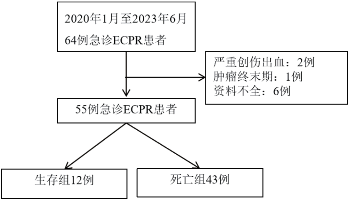 尽管医疗技术不断革新,但是心脏骤停(cardiac arrest, CA)患者抢救成功率仍处于较低水平。我国院内心脏骤停(in hospital cardiac arrest, IHCA)患者的生存率为9.1%[1],院外心脏骤停(out-of-hospital cardiac arrest, OHCA)患者的存活率仅为1.15%[2]。体外心肺复苏(extracroporeal cardiopulmonary resuscitation,ECPR)指对心脏骤停患者应用体外膜肺氧合(extracorporeal membrane oxygenation,ECMO)维持循环灌注及氧供支持的技术[3]。截至2023年4月,体外生命支持组织(ELSO)发布的成人ECPR病例达14 509例,并以每年超过1 700例的速度快速递增[4]。本研究回顾本院急诊科55例ECPR患者的病例资料,分析影响其预后的因素。