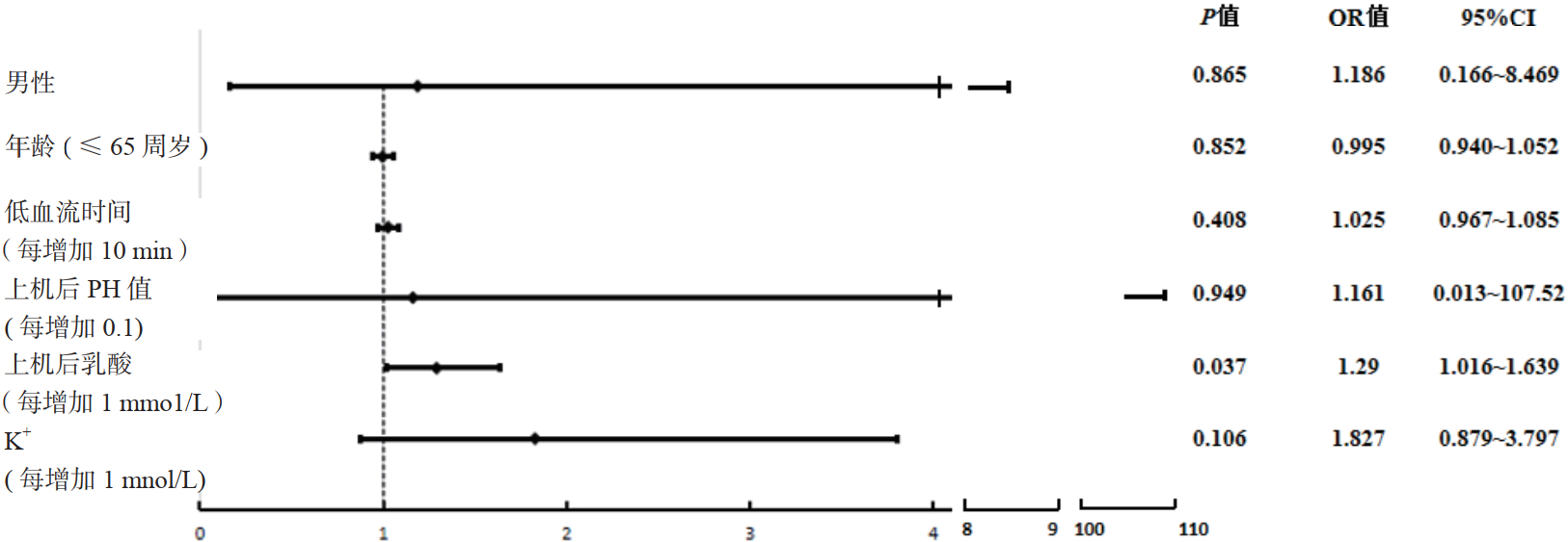 将经单因素分析发现两组间差异有统计学意义的指标以及部分临床指标纳入二分类单因素Logistic回归分析,对分类变量进行赋值,连续变量以实际数值统计。结果显示,低血流时间(OR=1.049, 95% CI: 1.004~1.095, P=0.032)、上机后pH值(OR=0.020, 95% CI: 0.001~0.651, P=0.028)、上机后乳酸值(OR=1.322, 95% CI: 1.096~1.594, P=0.004)和K+浓度(OR=2.053, 95% CI: 1.059~3.980, P=0.033)是评估患者预后的危险因素,见表 2。多因素二元Logistic回归分析表明,上机后乳酸值(OR=1.316, 95% CI: 1.029~1.683, P=0.029)是预测ECPR患者预后不良的独立危险因素,见表 3、图 2。