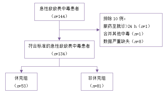 敌敌畏属于高毒类的OP,本研究通过回顾急性敌敌畏中毒患者临床资料,分析其合并休克的临床特征、危险因素及预后,以期对急性敌敌畏中毒合并休克的早期识别、防治策略及改善预后等提供临床依据。