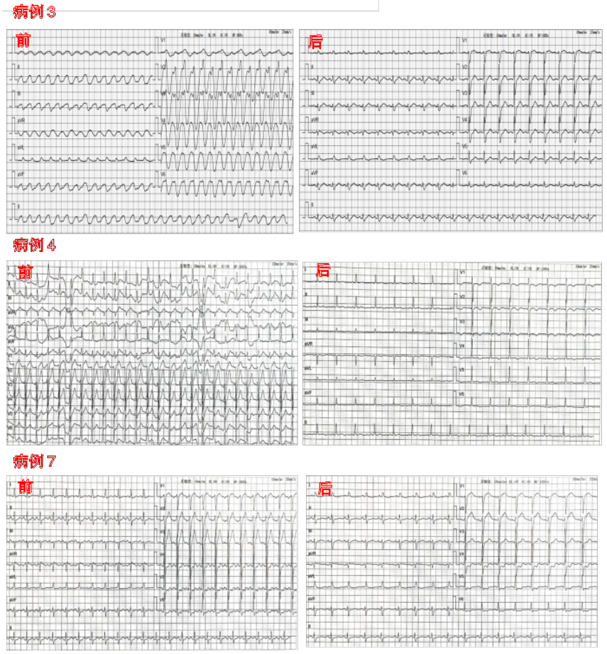 | 图 1 3例存活患者ECMO治疗前后心电图 |