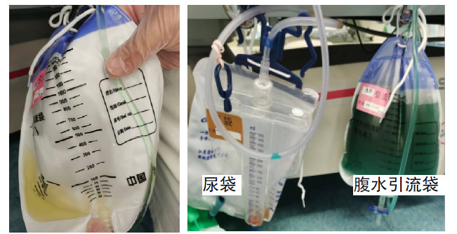 图 2 尿管注射美蓝后腹水引流情况