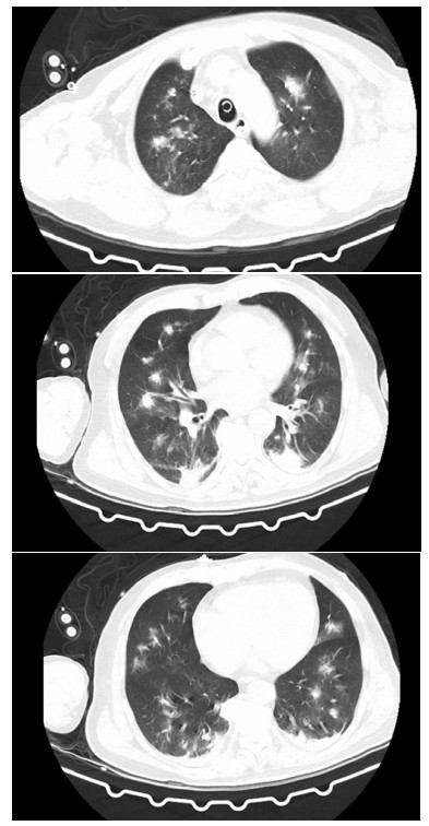 转入ICU后查体:神志模糊,躁动不安,偶有抽搐发作,呼吸急促,双肺可及湿罗音,立即予以气管插管接呼吸机辅助通气,镇痛镇静,头孢哌酮舒巴坦抗感染,继续予以利巴韦林抗病毒、免疫球蛋白应用以及保护脏器功能等对症治疗。2022-05-22患者布尼亚病毒核酸结果提示4.6×106 copies/mL,布尼亚抗体IgM阳性,相关化验提示:白细胞4.4×109/L,中性粒细胞绝对值3.03×109/L,血红蛋白141 g/L,血小板52×109/L,肌酐190 μmol/L,动脉血气pH 7.264,PO2 51.2 mmHg(1 mmHg=0.133 kPa),BE -8.3 mmol/L。床边胸片提示双肺炎症(见图 1),呼吸机支持参数较高,2022-05-23行床边气管镜检查(见图 2),气管内可见大量灰白色浓稠痰液,可见拉丝,予以充分抽吸并送检肺泡灌洗液,送检血G试验600 pg/mL,GM试验1.01 pg/mL,考虑重症肺炎,真菌感染可能,美国西弗吉尼亚大学医院深部真菌感染危险因素评分31分,予以调整抗感染方案为美罗培南联合伏立康唑抗感染治疗。2022-05-24患者肌酐持续升高,无尿伴代谢性酸中毒,予以行床边CRRT治疗。2022-05-27患者痰培养及肺泡灌洗液提示焦曲霉,进行CT检查,提示双肺异常密度(见图 3),予以调整抗感染治疗方案为头孢哌酮舒巴坦、伏立康唑、卡泊芬净抗感染治疗。经治疗后患者氧和指数稍好转,血小板计数较前升高(见图 4),2022-05-31患者家属因经济问题要求出院,1月后随访患者死亡。本研究通过医院伦理委员会批准(审批号:YX2022-041)。