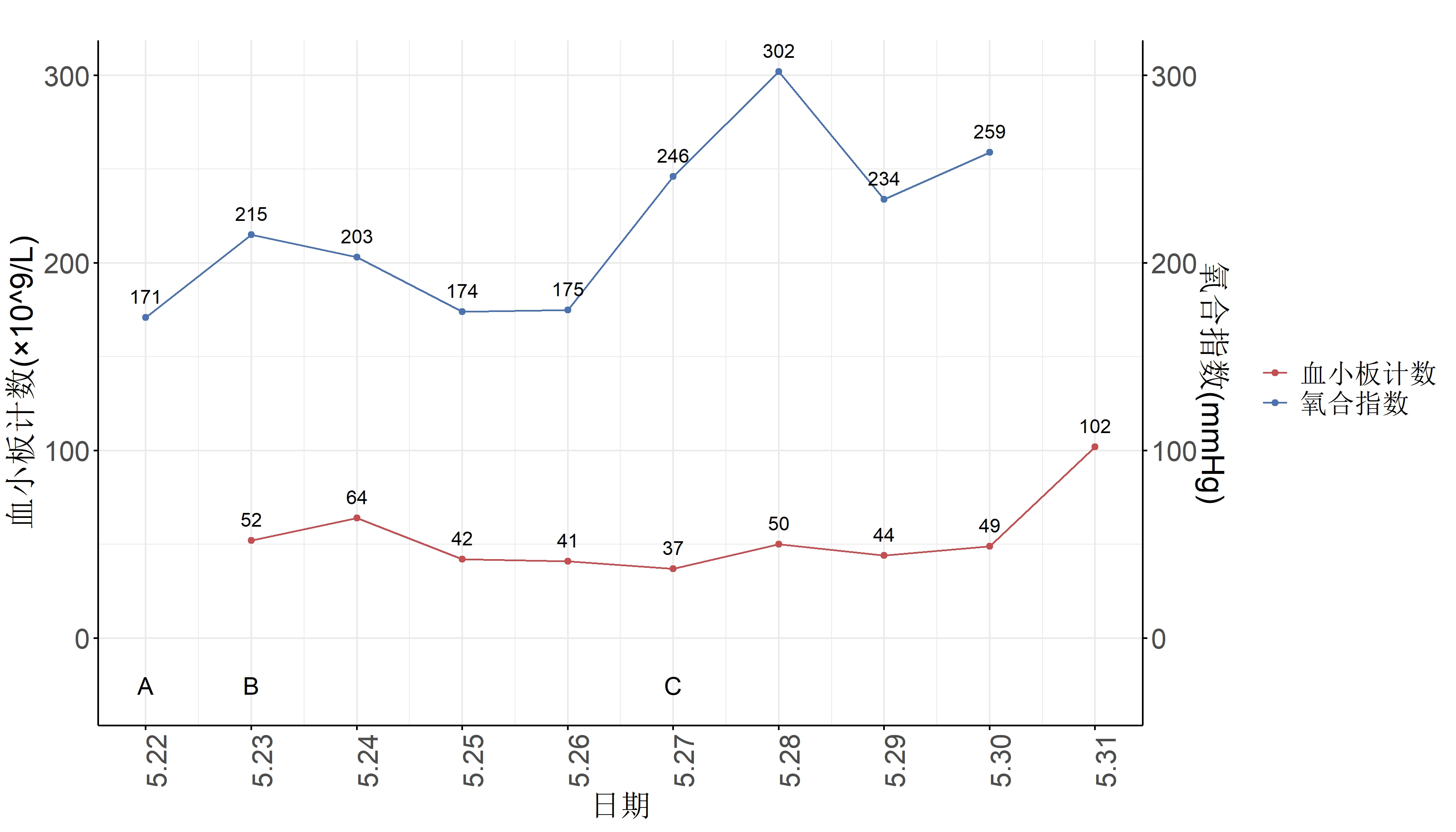 A点为使用头孢哌酮舒巴坦,B点为使用美罗培南+伏立康唑,C点为使用伏立康唑+卡泊芬净+头孢哌酮舒巴坦 图 4 患者入ICU后抗生素使用及血小板计数和氧和指数的变化