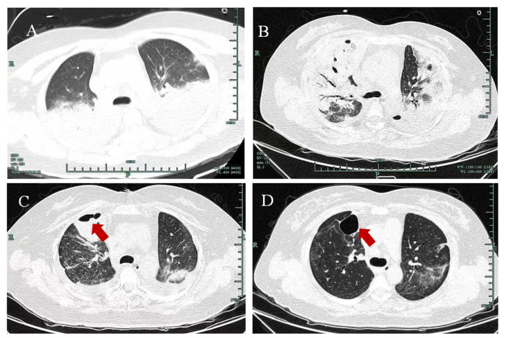 | A:双下肺大面积实变;B:感染较前吸收,右侧胸腔积液增多;C:感染较前吸收,右上肺可见空洞形成;D:右上肺薄壁空洞 图 1 病例1胸部CT检查结果 |