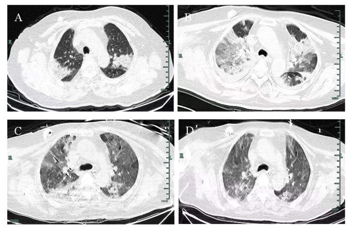 | A:双肺多发感染;B:双肺感染较前增加;C:肺部感染较前吸收;D:肺部感染较前吸收 图 2 病例2胸部CT检查结果 |
